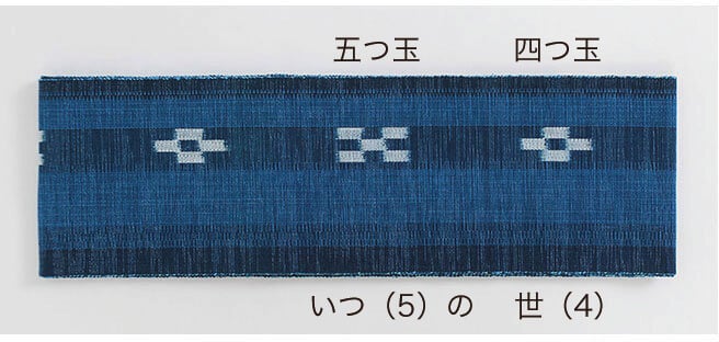 特徴的な絣模様は、五つと四つの■(四角)が並んでおり、それぞれ「いつ(五つ)の」「世(四つ)」を表現。「いつの世までも末永く仲睦まじく」との想いが込められ、かつては島の女性たちが大切な人への贈り物として織っていたと伝えられています。この帯に込められた“人を想う気持ち”は、現代においても多くの人の心に響く、普遍的なメッセージです。