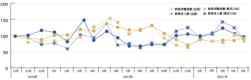 ~ 3つのポイント ~ 1.保育士就職・転職市場において、有料職業紹介を利用している求職者数と求人数の推移を計測。 全体値でみると求職者は上昇し求人数は低下しているが、都内23区では求職者・求人数ともに減少傾向にある。
