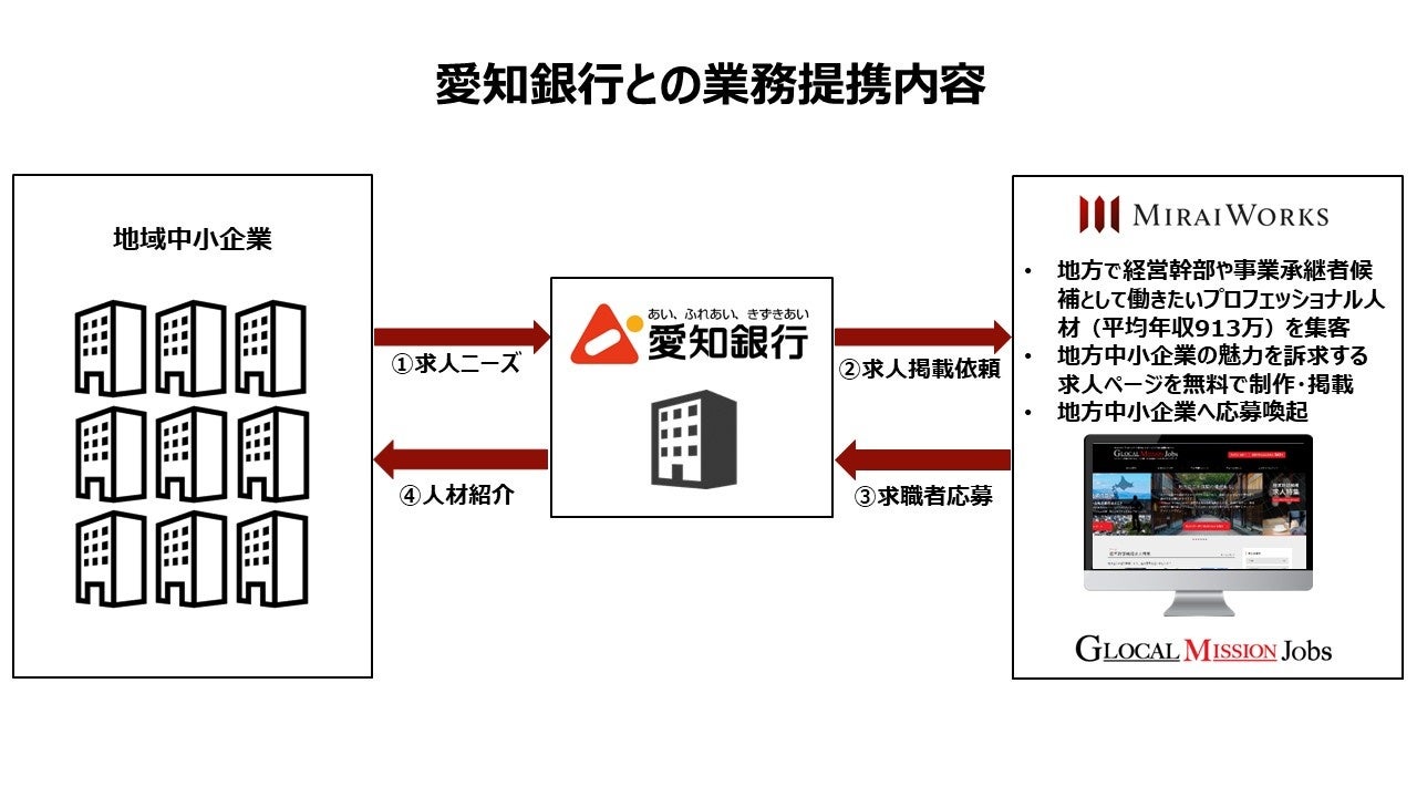 今回、地方中小企業へ経営幹部や事業承継者として転職を希望する都市部人材16,000名以上が登録する『Glocal Mission Jobs(GMJ)』と提携することにより、愛知銀行のお取引先の人材課題解決の強化を目指します。