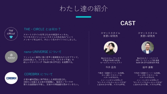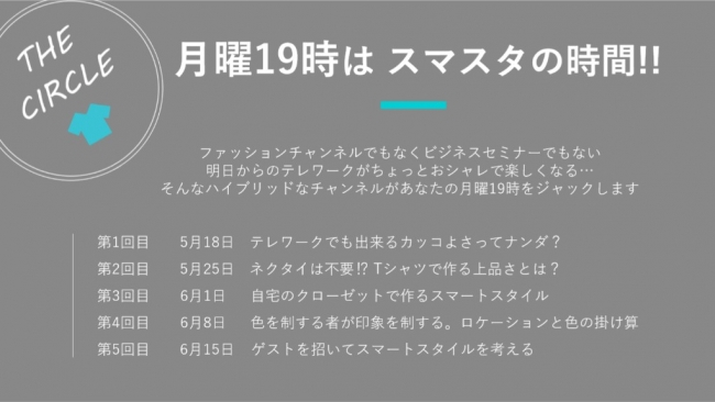 番組内容は、この情勢を機に増えると思われるテレワークでの商談・会議・コミュニケーションでの身だしなみの解説、提案をさせて頂きます。出演者は、セレブリックス 営業企画本部 本部長今井 昌也、ナノ・ユニバース PR/マーケティング部 部長田中直樹。ファッションチャンネルでもビジネスセミナーでもない、明日からのテレワークが楽しくなる・・・そんなハイブリッドのチャンネルを是非お楽しみ下さい。