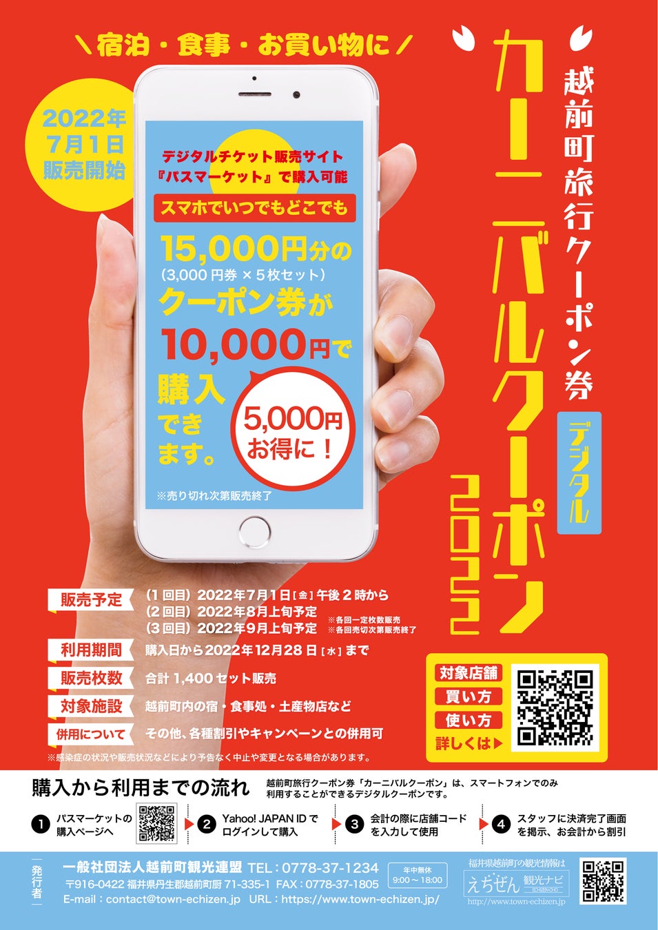 一般社団法人越前町観光連盟では、新型コロナウイルスの影響で落ち込んでいる地域経済への支援とするため、15,000円分(3,000円×5枚綴り)の旅行クーポン券を10,000円で購入することができる越前町旅行クーポン券「カーニバルクーポン」を、Yahoo! JAPANが運営するデジタルチケット販売サイト「パスマーケット」内にて、デジタル旅行クーポン券として7月1日(金)の午後2時から販売いたします。