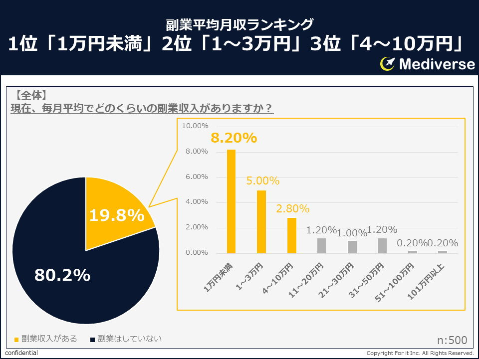 今回のアンケート調査結果では、約2割がなんらかの副業収入を得ており、その多くは「1万円未満」もしくは「1~3万円」程度であることが判明いたしました。