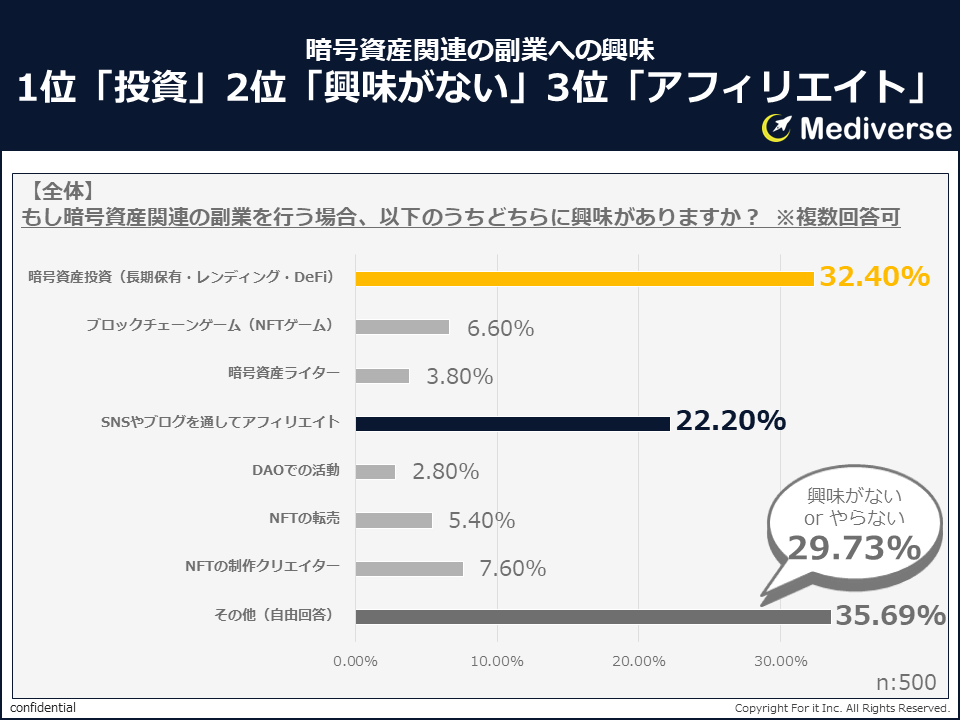 そのため、自由回答者の内容を踏まえると、「暗号資産投資(長期保有・レンディング・DeFi)」32.40%、「暗号資産には興味がないorやらない」29.73%、「SNSやブログを通してアフィリエイト」22.20%となる。