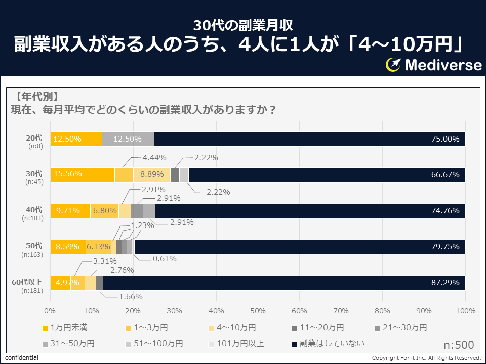 年代別に見ると、30代は「副業をしていない」と回答する割合がもっとも少ない66.67%に留まっており、裏を返すと、3人に1人以上はなんらかの副業収入を得ていることになる。なお、副業収入額別に見ると、副業収入を得ている人のうち4人に1人は「4~10万円」と回答していた。