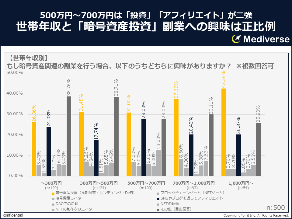 世帯年収別に見ると、「その他(自由回答)」を考慮しない場合、いずれの年収層でも「暗号資産投資(長期保有・レンディング・DeFi)」が首位を占めていた。さらに、世帯年収に比例してこの割合は高まっており、1,000万円以上の年収層では約半数にまで達していた。