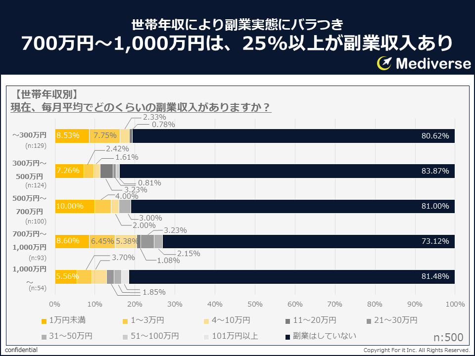 世帯年収別に見ると、700万円~1,000万円の年収層は、4人に1人以上がなんらかの副業収入を得ており、うち75%は「~10万円」に集中していた。