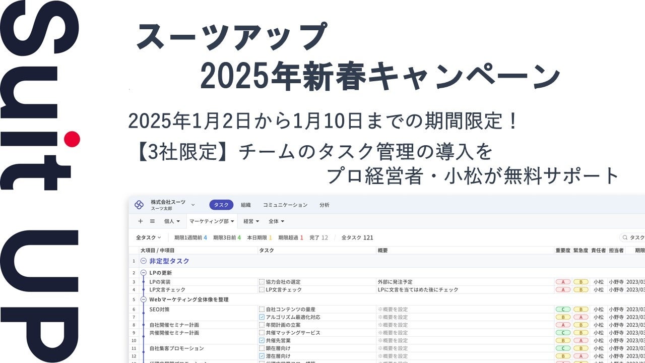 2025年1月2日から10日までの期間に、スーツアップの無料お試し30日にお申込みいただきました会社様のうち3社限定で、当社代表者であり中小・中堅企業やスタートアップのバリューアップに実績のあるプロ経営者の小松自ら、チームのタスク管理の導入サポートを無料で行うキャンペーンを実施します。