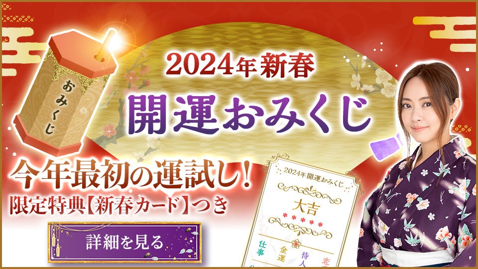 新春限定で2024年の開運画像セットが登場!運勢の吉凶とアドバイスがついた「開運おみくじ画像」や、2024年の天星別ラッキーカラーを取り入れた「お守り待ち受け画像」、縁起物の干支にちなんだ「厄除け新春カード画像」の3つの開運画像をセットにしました。2024年2月29日までの限定公開なのでお見逃しなく。