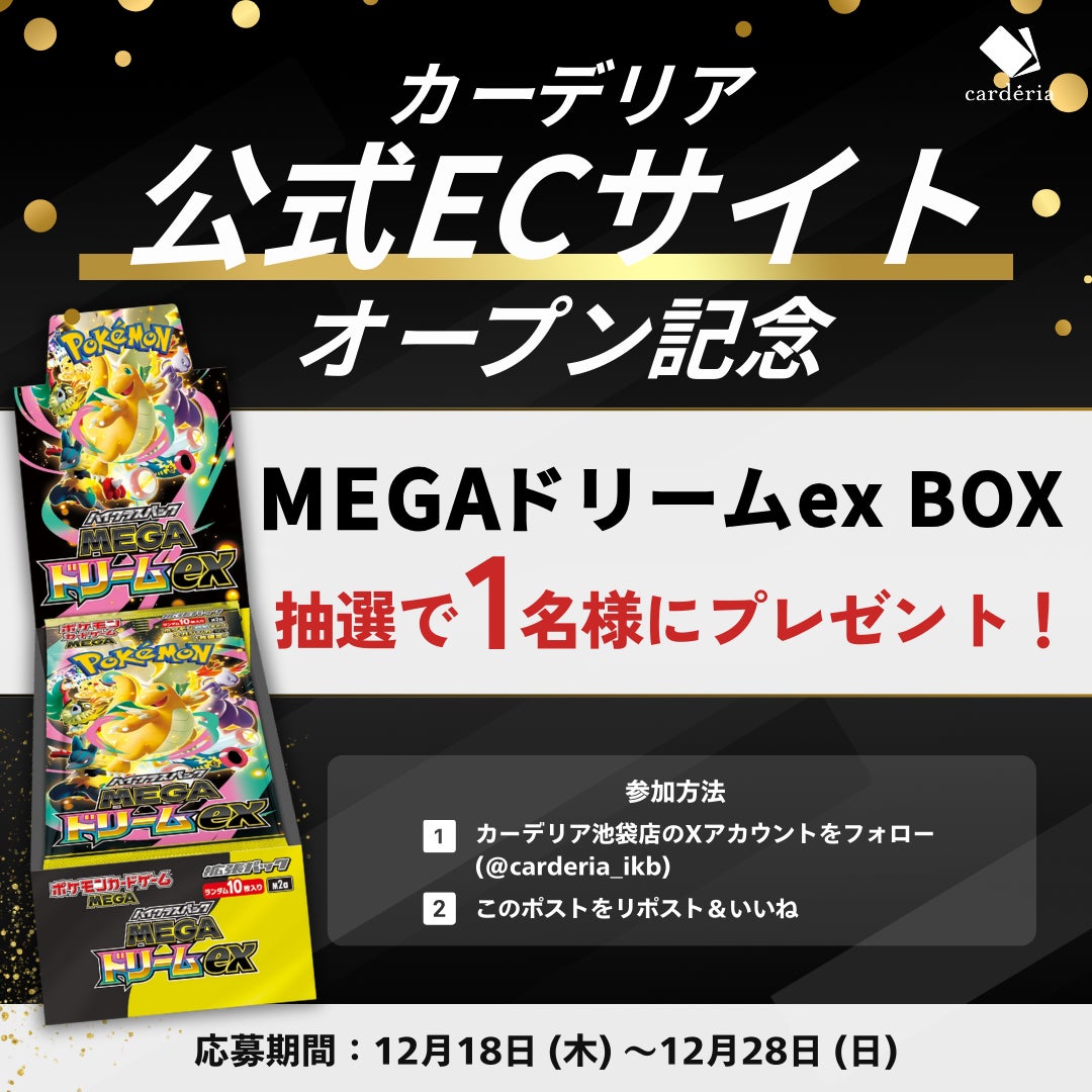 公式ECサイトのオープンを記念し、cardéria(カーデリア)池袋店の公式Xアカウントにて抽選で「MEGAドリームex 1BOX」を1名様にプレゼントするキャンペーンを実施いたします。日頃よりcardéria(カーデリア)をご利用いただいている方はもちろん、今回初めてcardéria(カーデリア)を知っていただく方にもお楽しみいただける企画です。