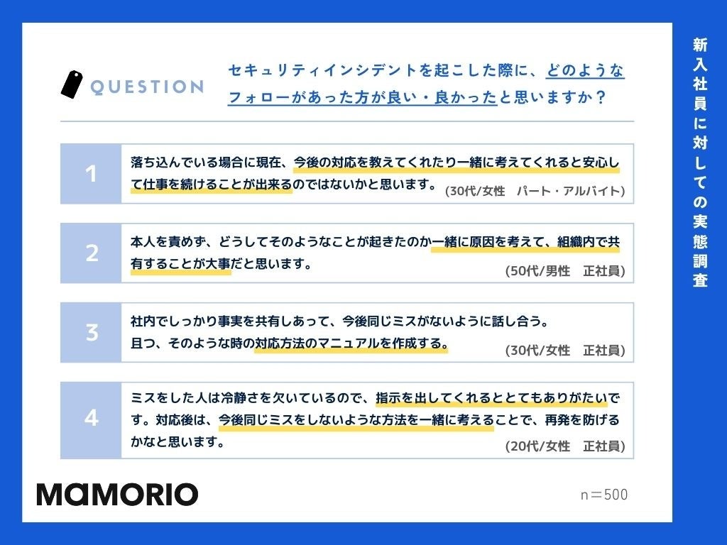 最後に、「セキュリティインシデントを起こした際に、どのようなフォローがあった方が良い・良かったと思いますか?」と質問をしたところ、以下のような回答が寄せられました。