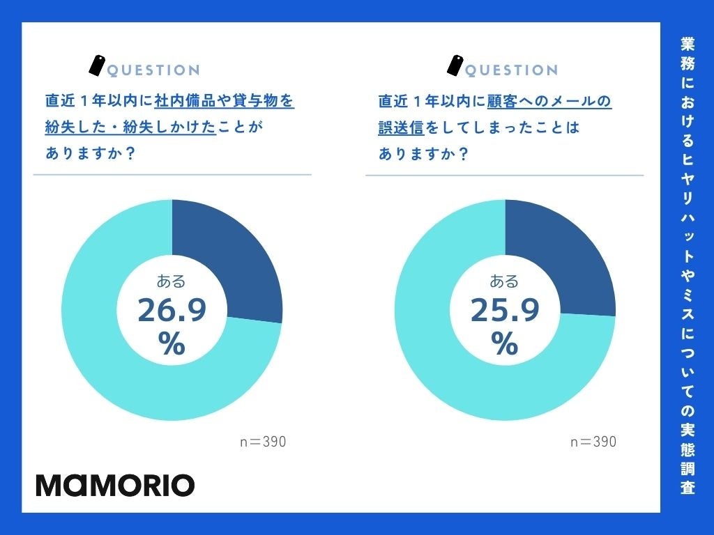 まず、「直近1年以内に社内備品や貸与物を紛失した・紛失しかけたことがありますか?」と質問をしたところ、回答者の26.9%が「ある」と回答し、「直近1年以内に顧客へのメールの誤送信をしてしまったことはありますか?」といった質問では、回答者の25.9%が「ある」と回答しました。