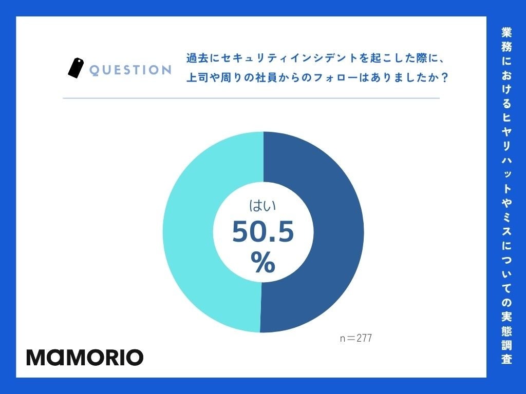 また、「セキュリティインシデントを起こした際に、上司や周りの社員からのフォローはありましたか?」といった調査を行ったところ、「はい」と回答した方は50.5%となり、フォローがあったと思う人・思わない人はおよそ半数ずつという結果となりました。