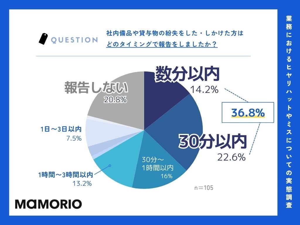 先の質問にて「社内備品や貸与物の紛失をした・しかけた方」が「どのタイミングで報告をしたか」調査したところ、「数分以内〜30分以内」と回答したのは36.8%という結果になりました。