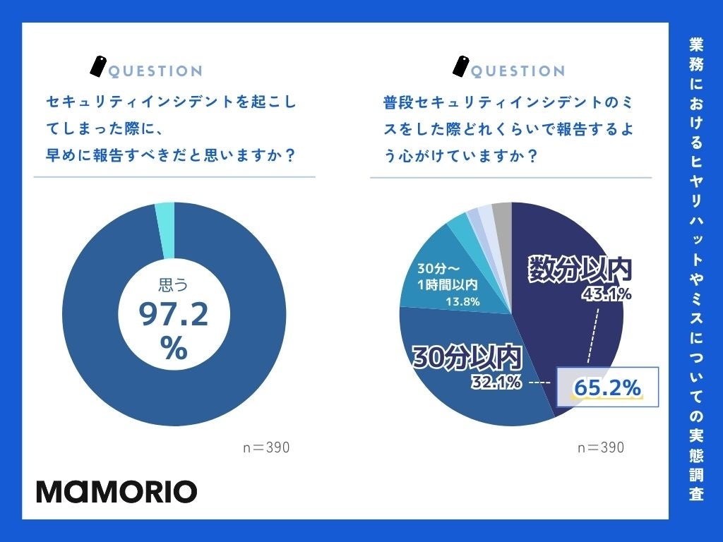 ですが、「普段セキュリティインシデントのミスをした際どれくらいで報告するよう心がけていますか?」という質問では「30分以内」と回答したのは65.2%という結果となりました。