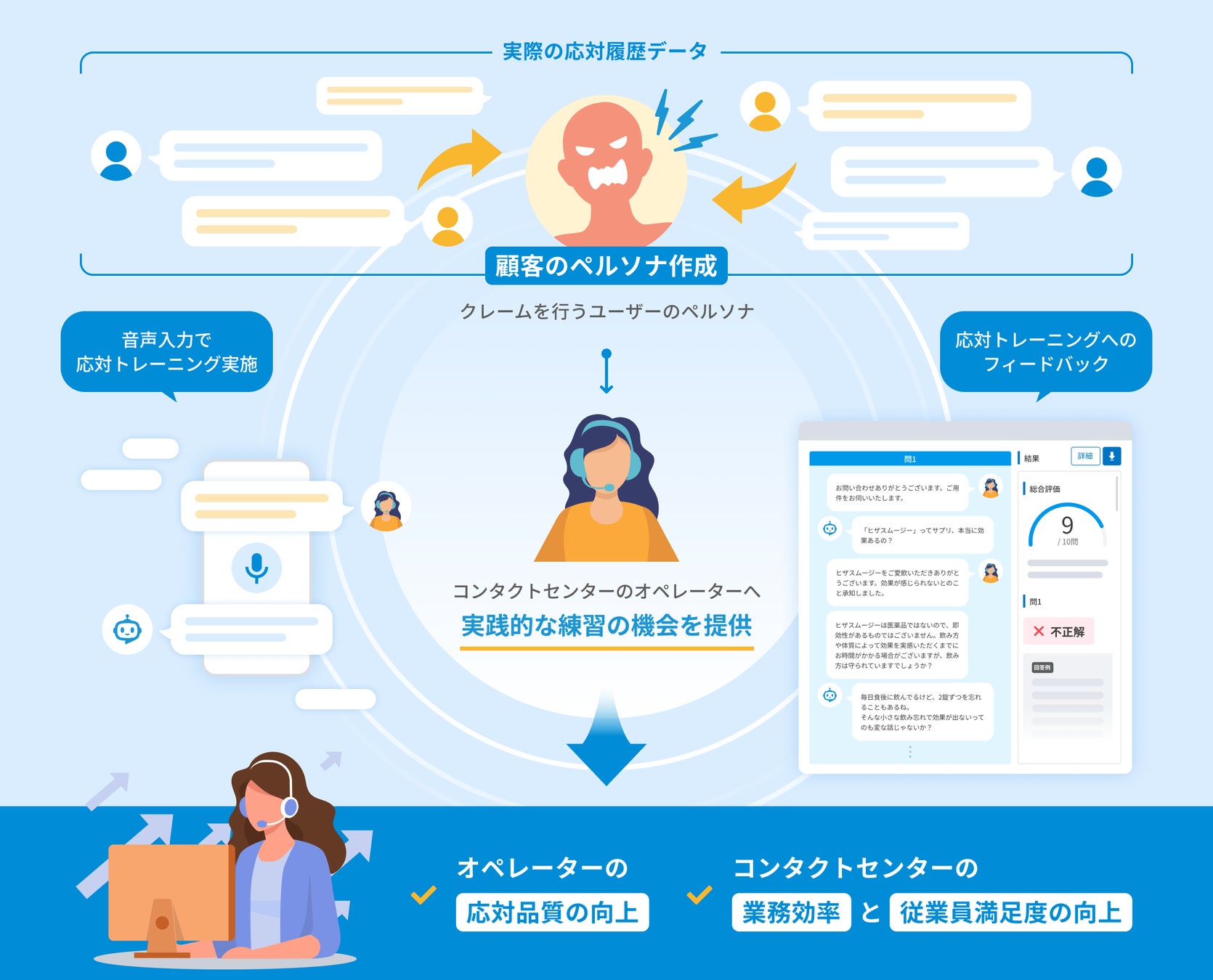 今回リリースする応対トレーニング機能では、生成AIを活用し、見える化エンジンに蓄積された通話記録やアンケートなどのデータに基づいてペルソナを設定し、実際の顧客応対に近い環境を想定したロールプレイングを行うことが可能となりました。