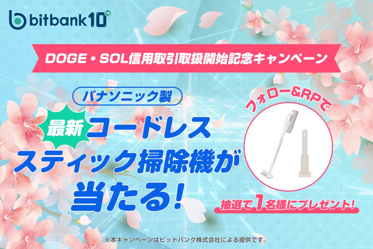 ビットバンク株式会社(本社:東京都品川区、代表取締役社長:廣末紀之、以下当社)は、本日より、信用取引において新たにドージコイン(DOGE)、ソラナ(SOL)の取扱いを開始しいたしました。これを記念して、4月18日(金)まで「Xフォロー&リポストでパナソニック製最新コードレススティック掃除機が当たる!」キャンペーンを開催します。