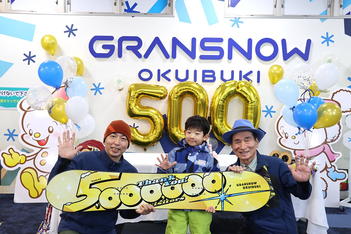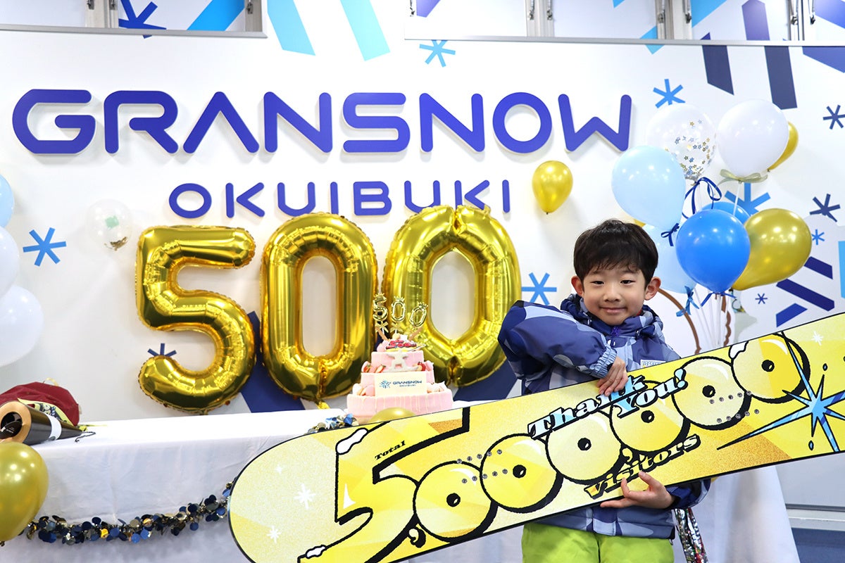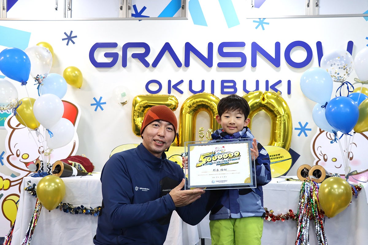 【500万人目の来場者になったのは大阪府大阪市在中の「杉本陸翔」君(7歳)「スキー場のシーズン券&グランピング施設の無料宿泊券」他「総額100万円分の豪華プレゼント!」を贈呈】
