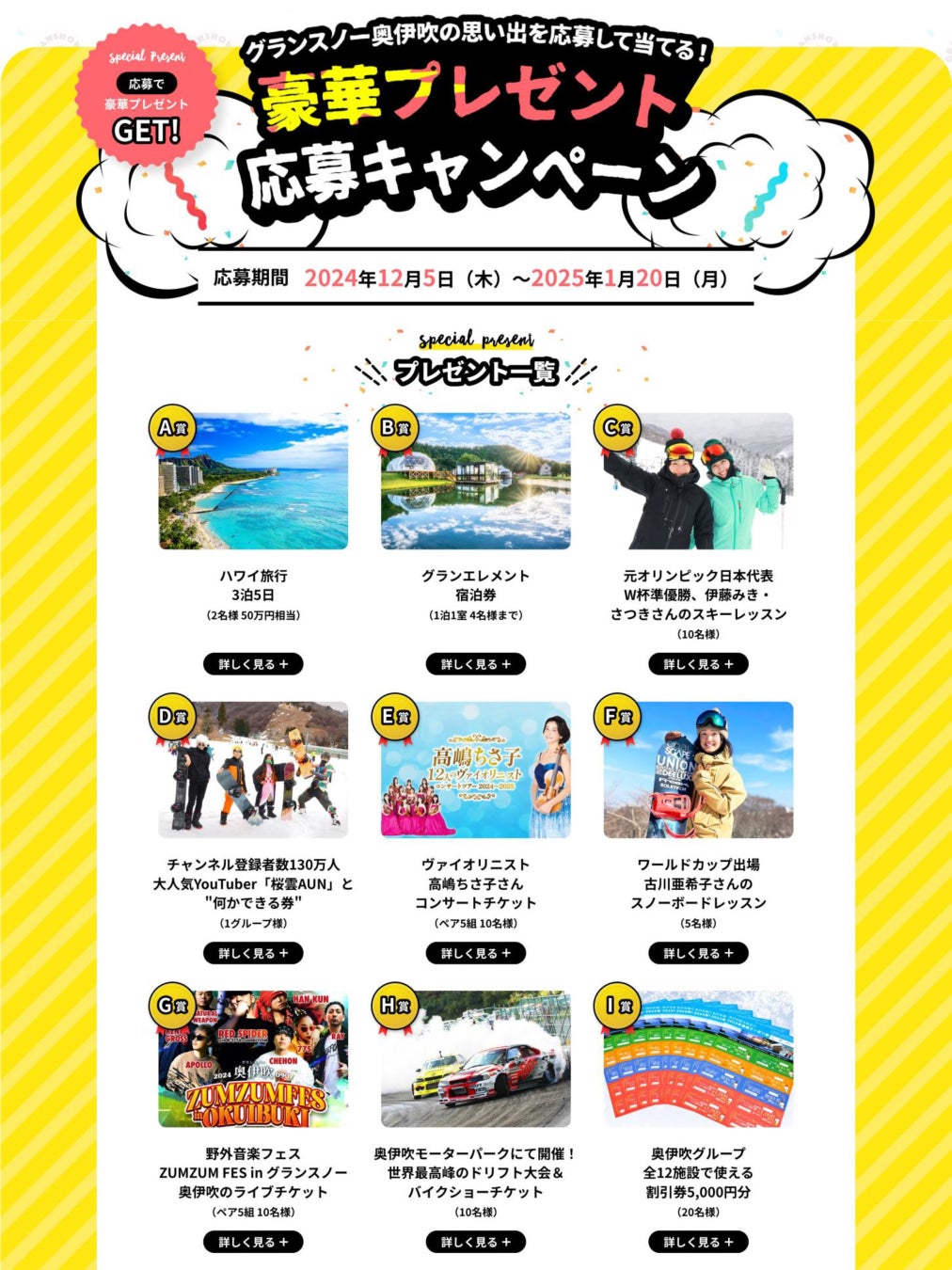 応募いただいた方の中から抽選で「ハワイ旅行」や「元オリンピック選手のスキーレッスン」「登録者数130万人超のYouTuberと”何かできる券”」「ヴァイオリニスト高嶋ちさ子さんコンサートチケット」「野外音楽フェス ライブチケット」「世界レベルのドリフト大会チケット」等…グランスノー奥伊吹との繋がりをもつ方々や施設とかかわる、超豪華なプレゼントを贈ります。