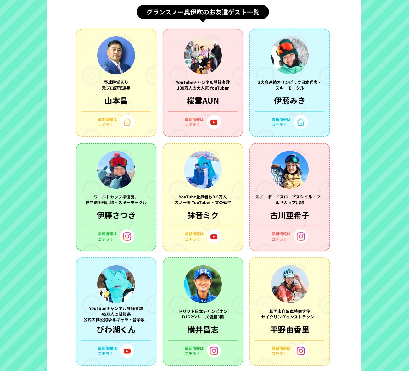 これまでのグランスノー奥伊吹に来てくれた500万人の中には「芸能人やアーティストからYouTuber、オリンピック選手まで」様々な有名人のお友達スペシャルゲストがいます。
