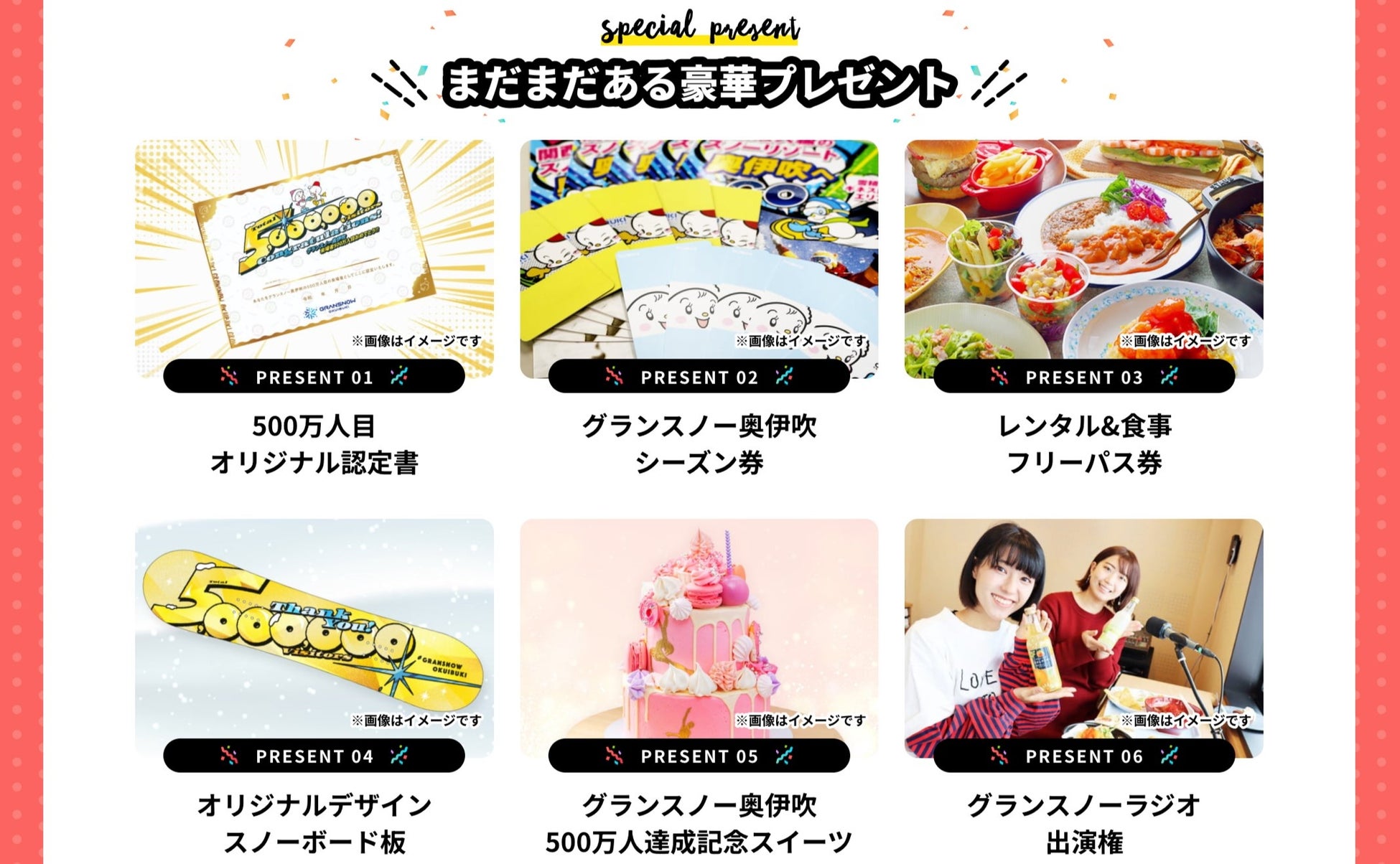 (500万人達成 認定証、記念スノーボード、オリジナルケーキ、シーズン券、食事&レンタル無料券)