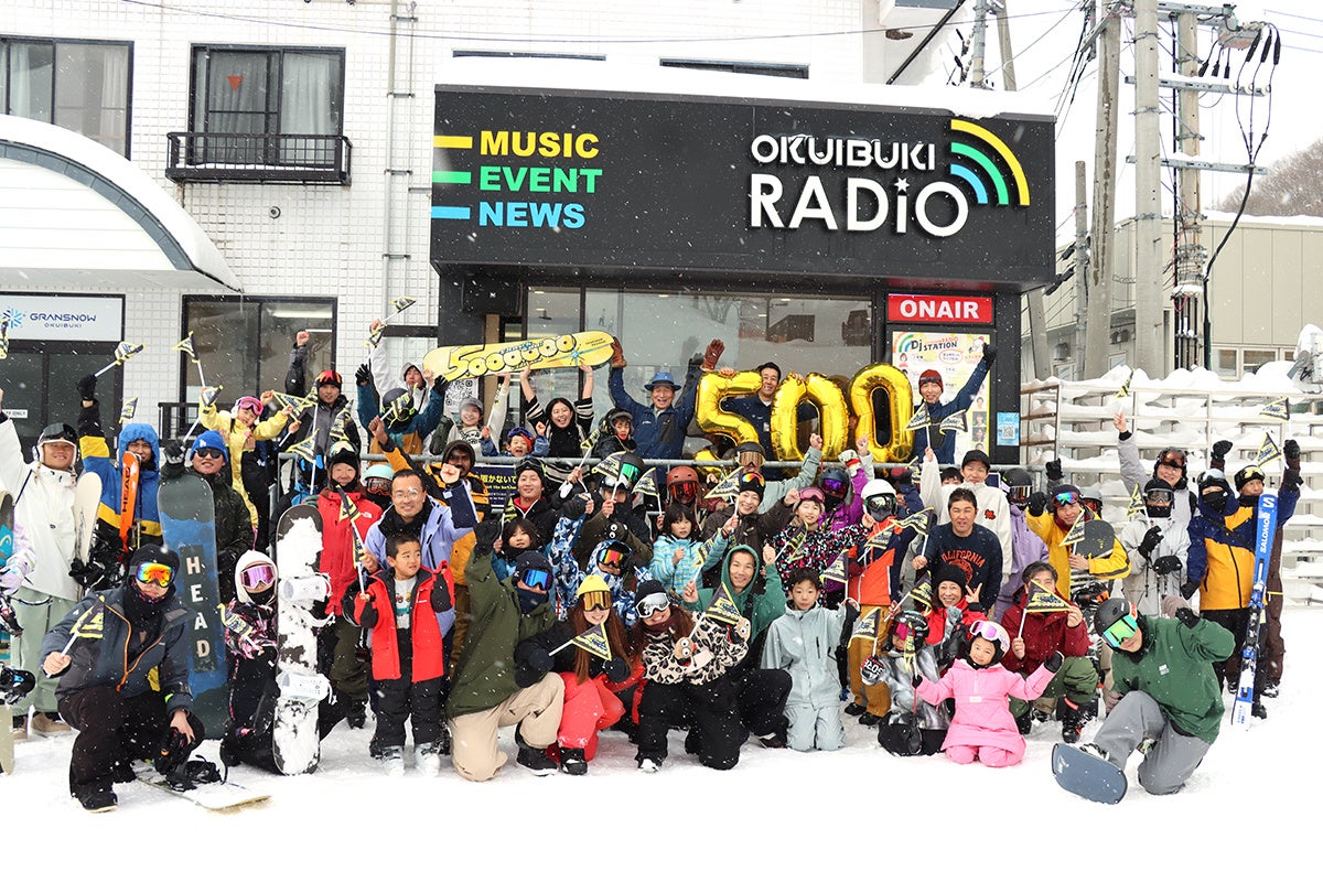 500万人達成を記念して、当日の来場者のみなさまとグランスノーラジオのブース前で記念動画を撮影。集まってくれた先着300名の方に記念フラッグをプレゼントしました。