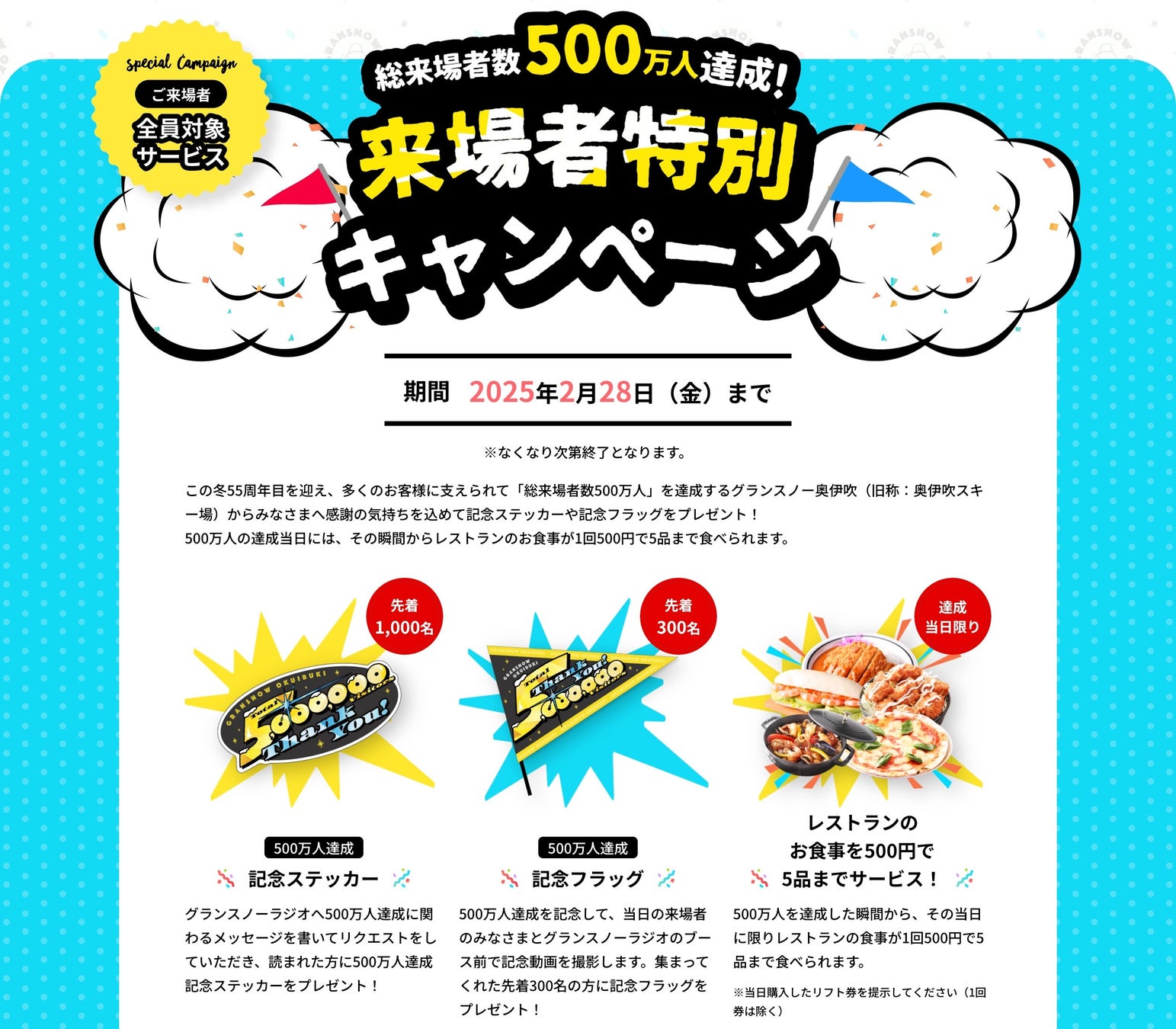 これまでグランスノー奥伊吹お越し下さった500万人全てのみなさまに、心からの感謝の気持ちを贈りたい。その想いを込めた「総来場者数500万人達成ありがとうキャンペーン」