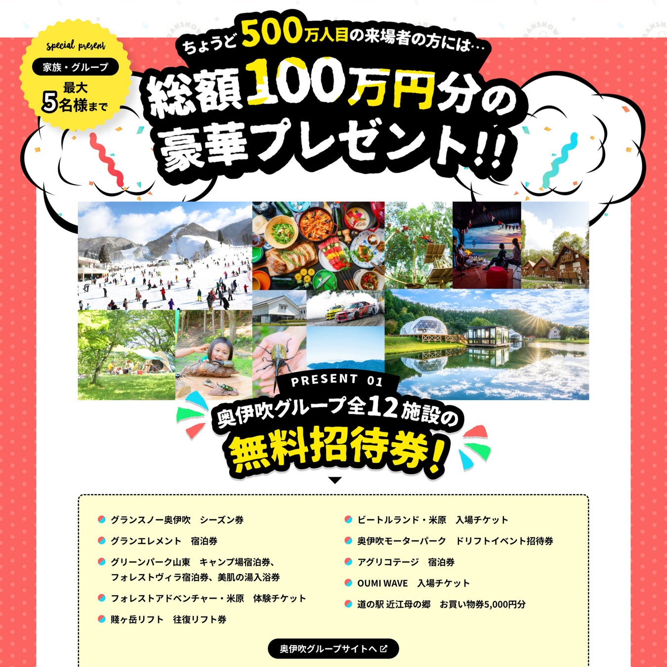 【”500万人目の来場者の方”に向けて贈る「総額100万円分の豪華プレゼント!!」奥伊吹グループ「全12施設の無料招待券!」をプレゼント!】