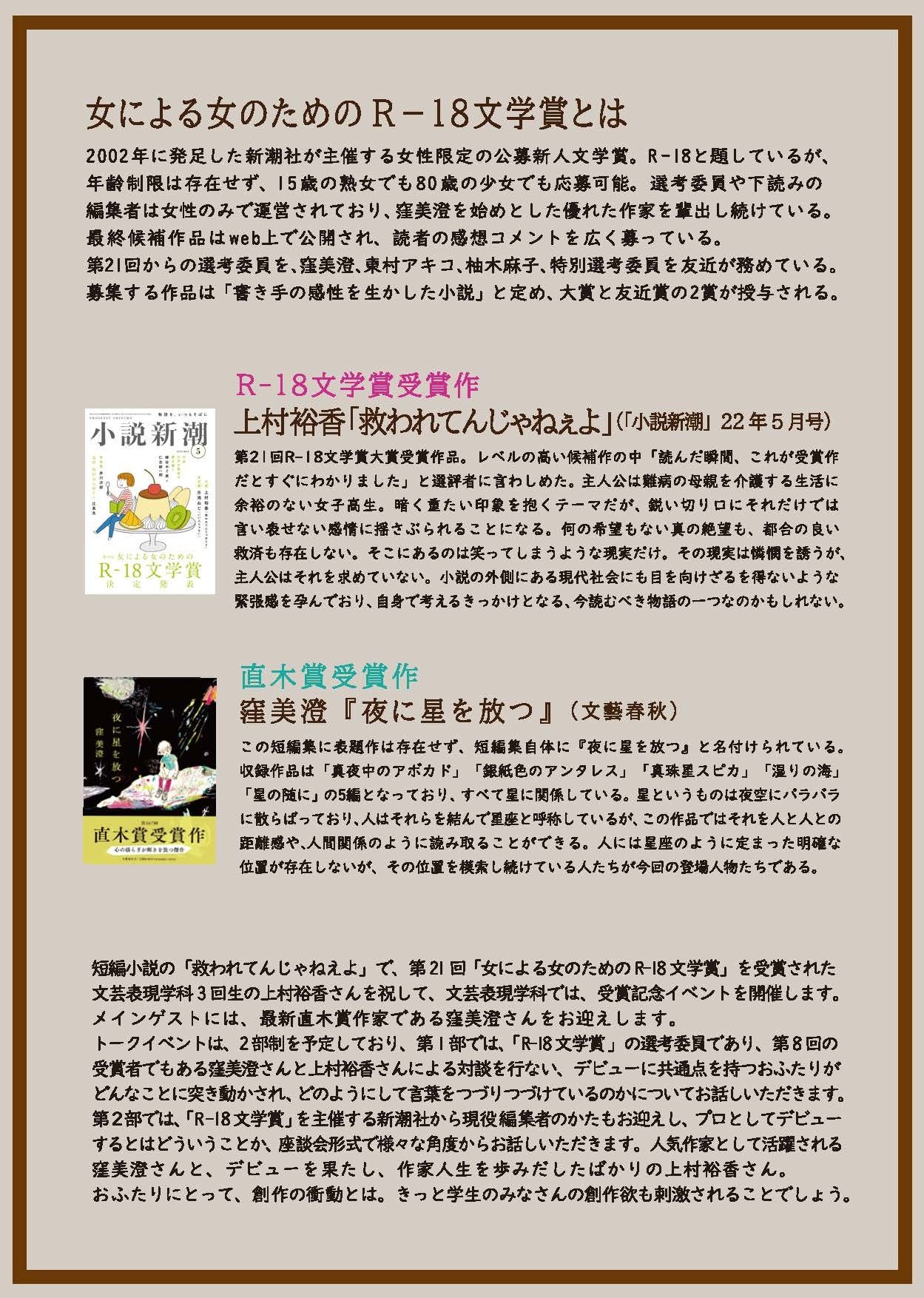 ・京都芸術大学 文芸表現学科3年生の上村裕香さんの小説『救われてんじゃねえよ』が、新潮社主催「R-18文学賞」の大賞を受賞されたことを祝し、受賞記念イベントを開催。