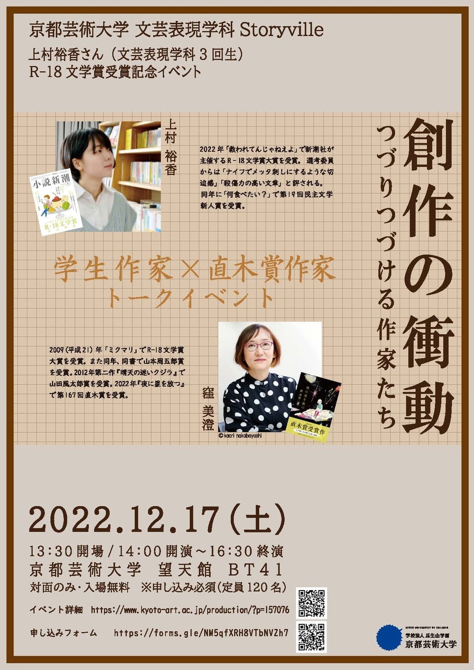 学校法人瓜生山学園 京都芸術大学(京都市左京区/学長 吉川左紀子)は、文芸表現学科3年生の上村裕香さんが小説『救われてんじゃねえよ』で、新潮社主催「女による女のためのR-18文学賞」の大賞を受賞されたことを祝し、受賞記念イベント『創作の衝動 つづりつづける作家たち』を開催します。対談のお相手には、22年上半期に直木賞を受賞された作家の窪美澄さんをお迎えします。
