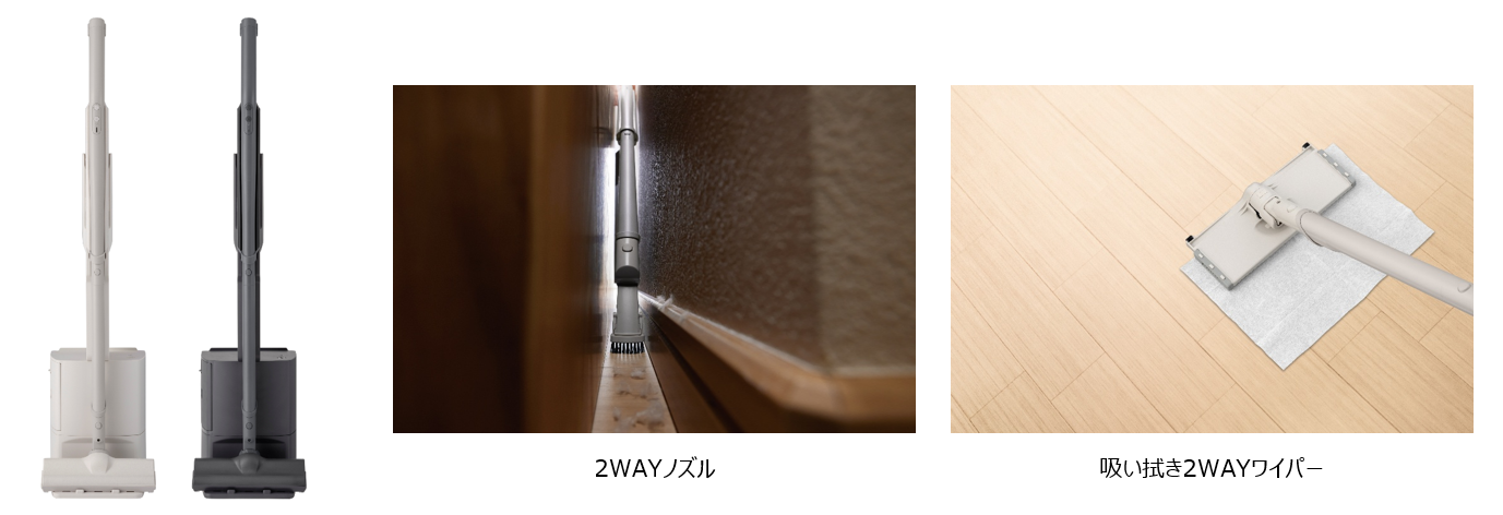 3. さまざまなゴミに対応する2WAYノズルや、吸い拭き2WAYワイパーをコンパクトに収納し、機能性と洗練された印象を両立