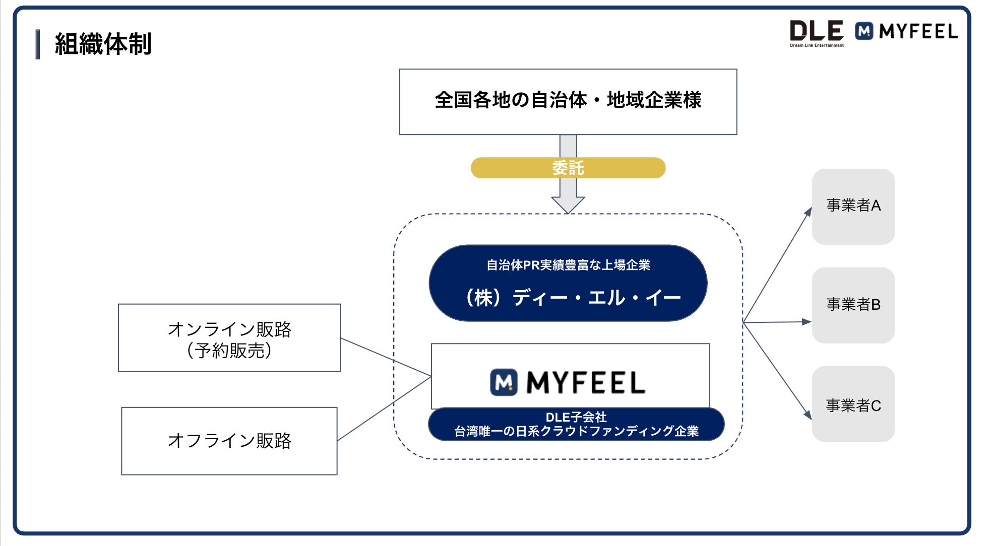 本事業スキームでは、自治体や地域企業はDLEに委託する形で参加します。実行はMYFEELが担い、オンライン・オフラインの両チャネルを活用して現地で展開を支援します。