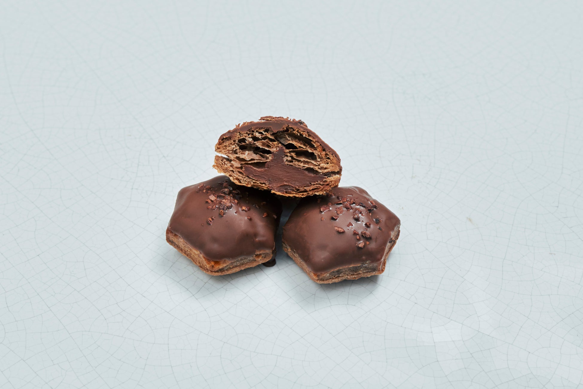 薄く繊細なビターチョコレートの中から、カカオバターで作るなめらかな生キャラメルがとろけ出します。「サイレントチョコレート」とも呼べるカカオバターが主役となり、香り高く鮮度を感じる味わいが実現。パリッと割れる瞬間に広がるカカオの奥深さと、生キャラメルの濃厚な美味しさをお楽しみください。