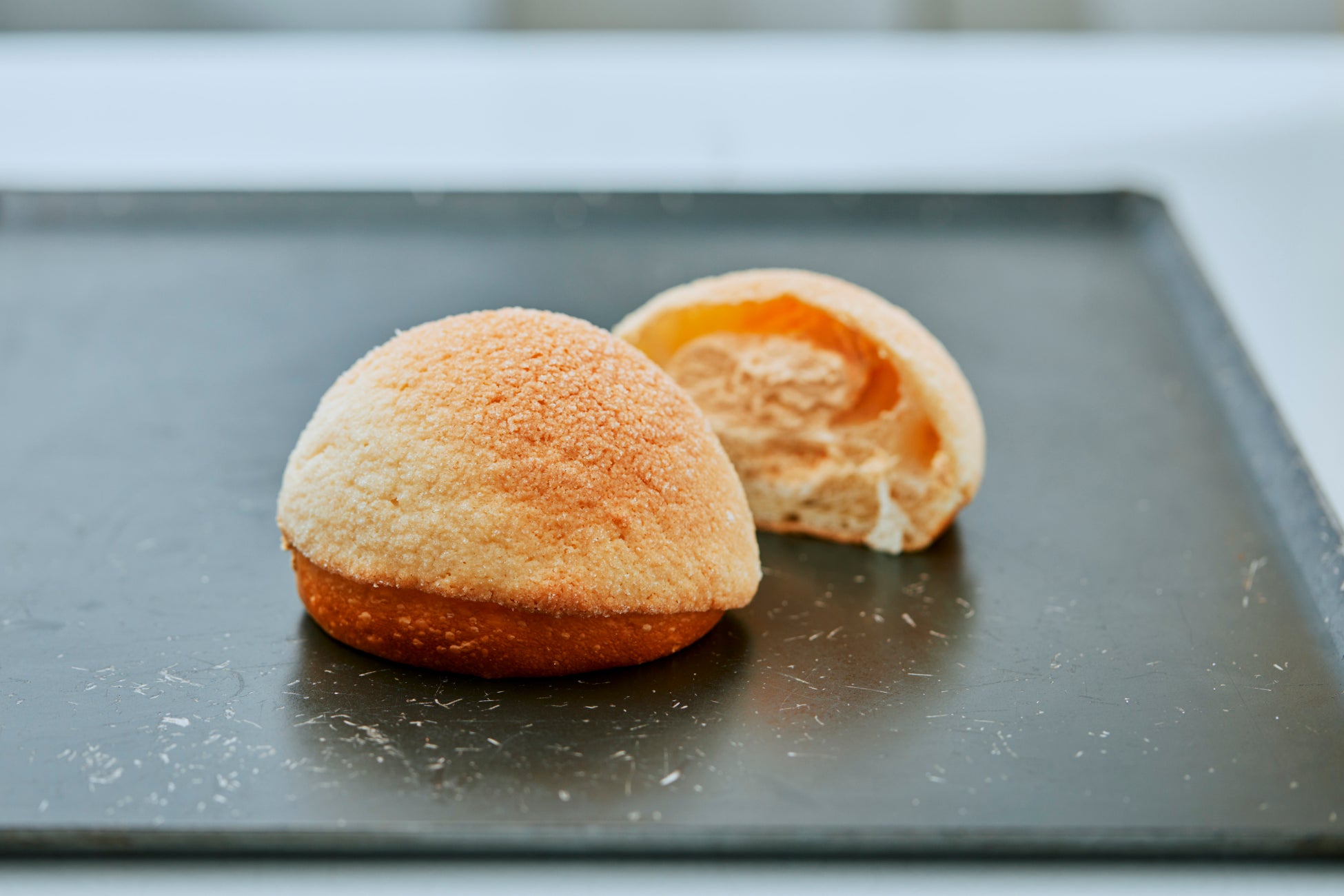 オイル、生地、クリーム、どれも植物性の100%ヴィーガンメロンパン。サクサクのクッキー生地、もちもちのパンの中は北海道富良野の大島農園の芳醇なメロン果汁をたっぷりと合わせた軽やかなクリームを絞りいれて。時間帯ごとに焼きたて、出来立てをご用意します。