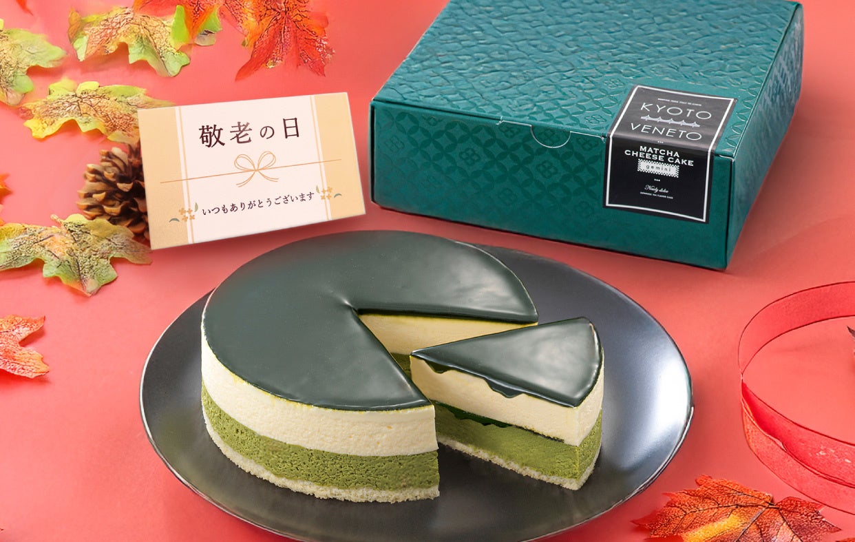 抹茶ベイクドチーズとレアチーズの二層のケーキに酸味のある抹茶ジュレを表面と中層に加えました。