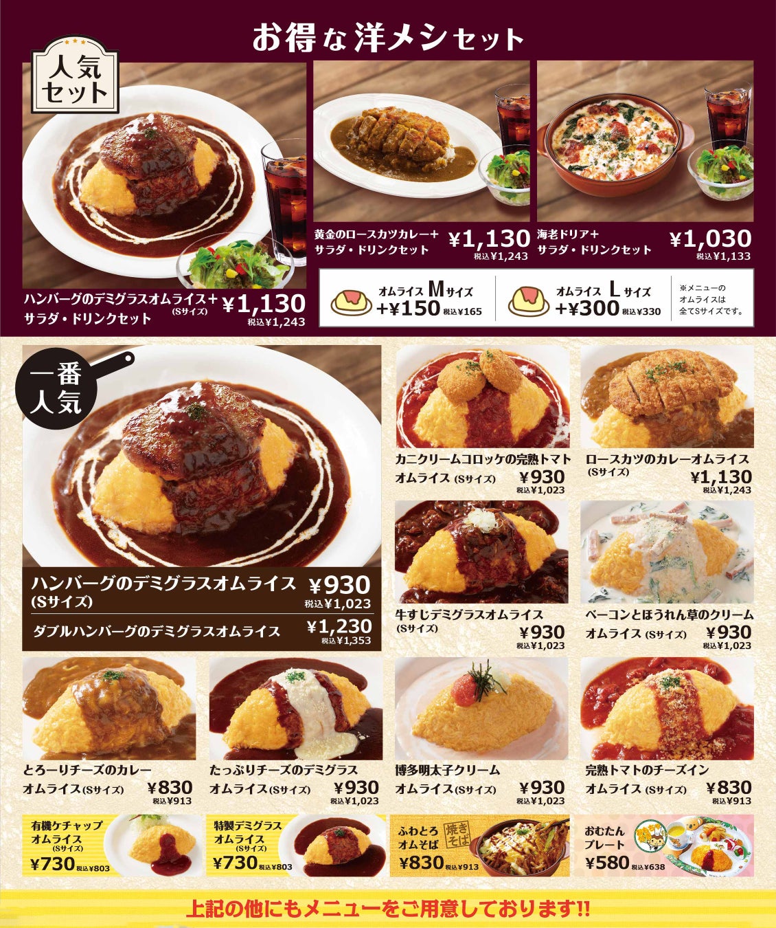 2024年6月24日オープンのおむらいす亭 沖縄イオンモール沖縄ライカム店から新規オープンの「フードコート」店舗のブランド名に「洋メシ」の称号を付け加えました。これは日本生まれの“洋食”であるオムライス、カツカレーなどを“洋メシ”と表現することで和モダンな洋食店「おむらいす亭」のコンセプトをより認知していただくことを意図したものでございます。そしてメニューにもお得な「洋メシセット」3種類ご用意させていただきました。