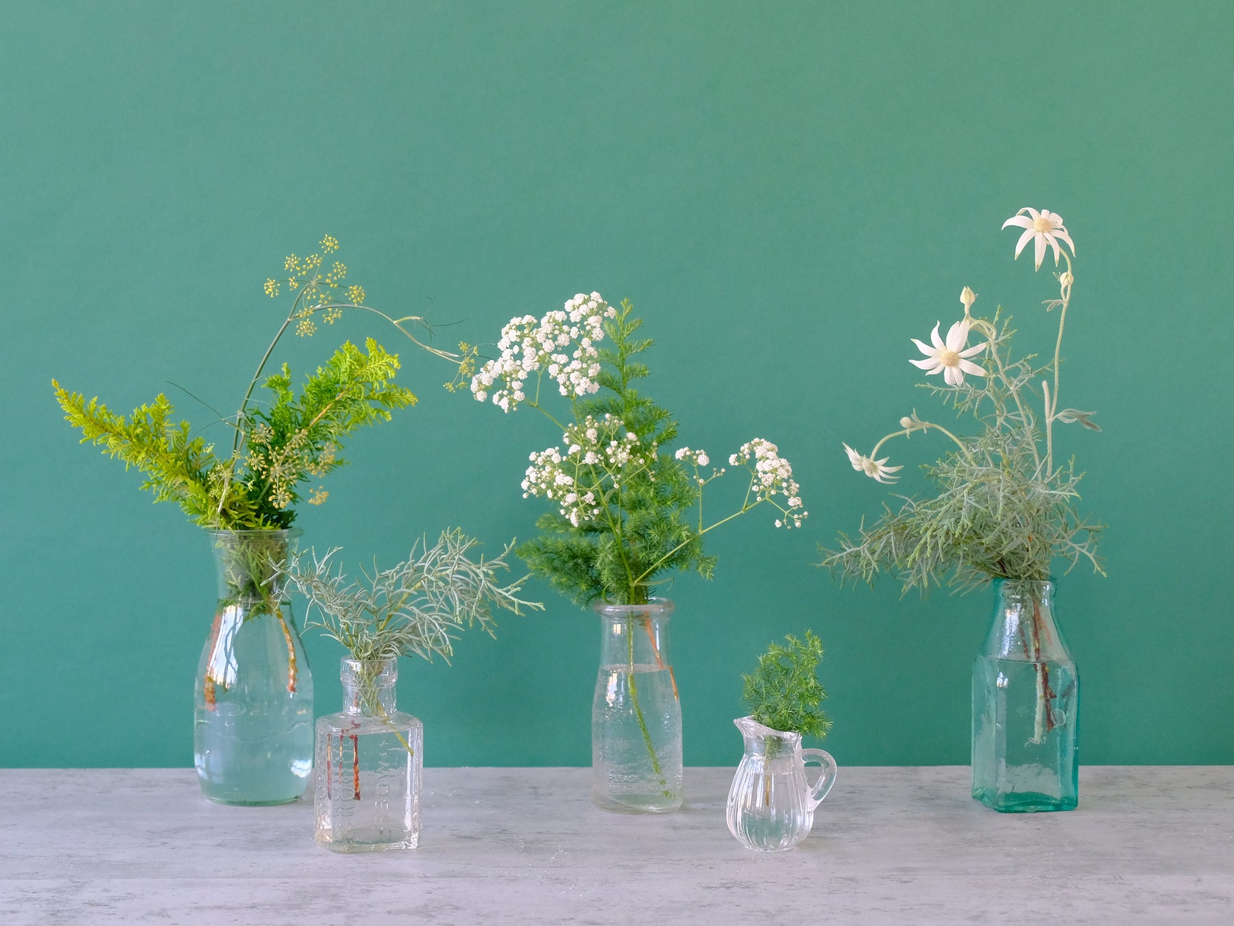 左上:様々な種類のコニファーと小花を一輪挿しにいけて並べてみました。コニファーはとても長持ちするのでコニファーだけをいけて観葉植物のように楽しんでも素敵です。