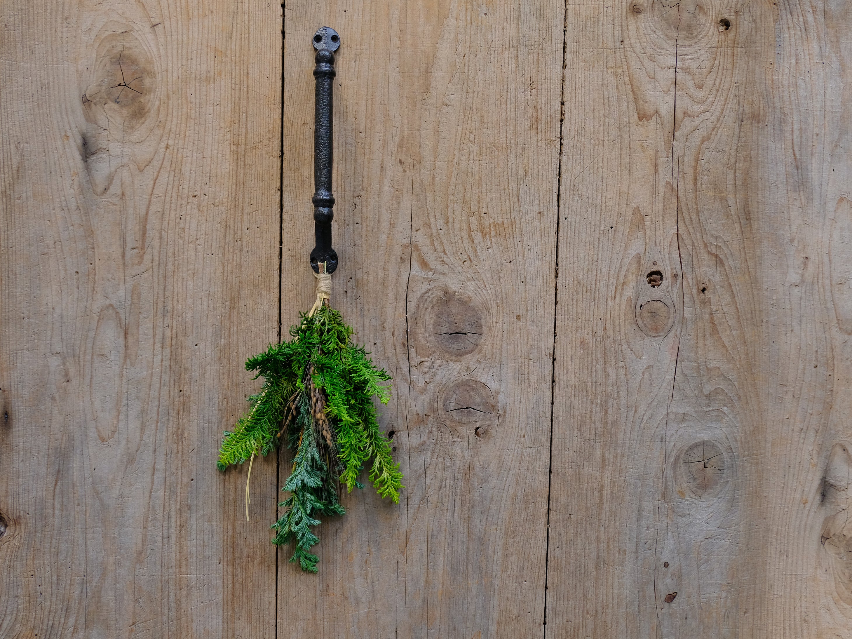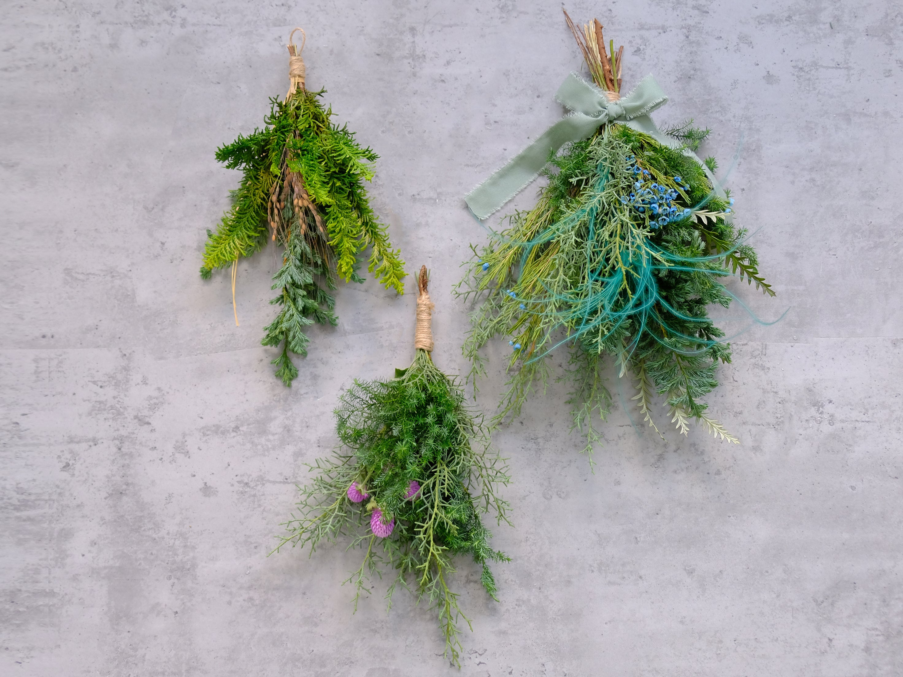 コニファー香るブーケS、Mをスワッグに。壁にディスプレイするように数個をまとめて飾っても素敵です。もちろんドアにつけて定番のドア飾りとしても楽しんでいただけます。