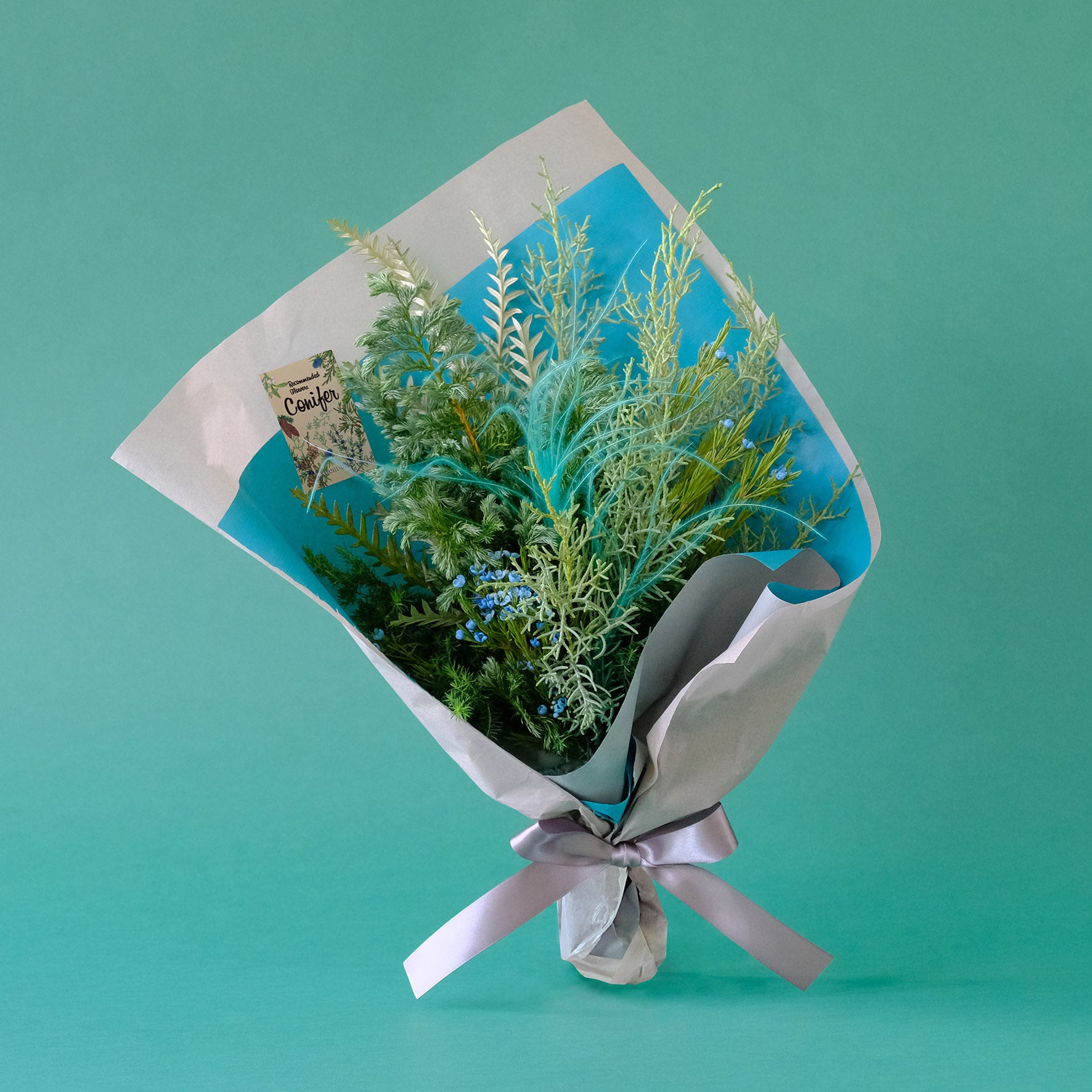 ショップおすすめのコニファーを程よいボリュームのブーケに仕上げました。季節の贈り物におすすめです。また逆さに吊るしてスワッグとしてもお楽しみいただけます。