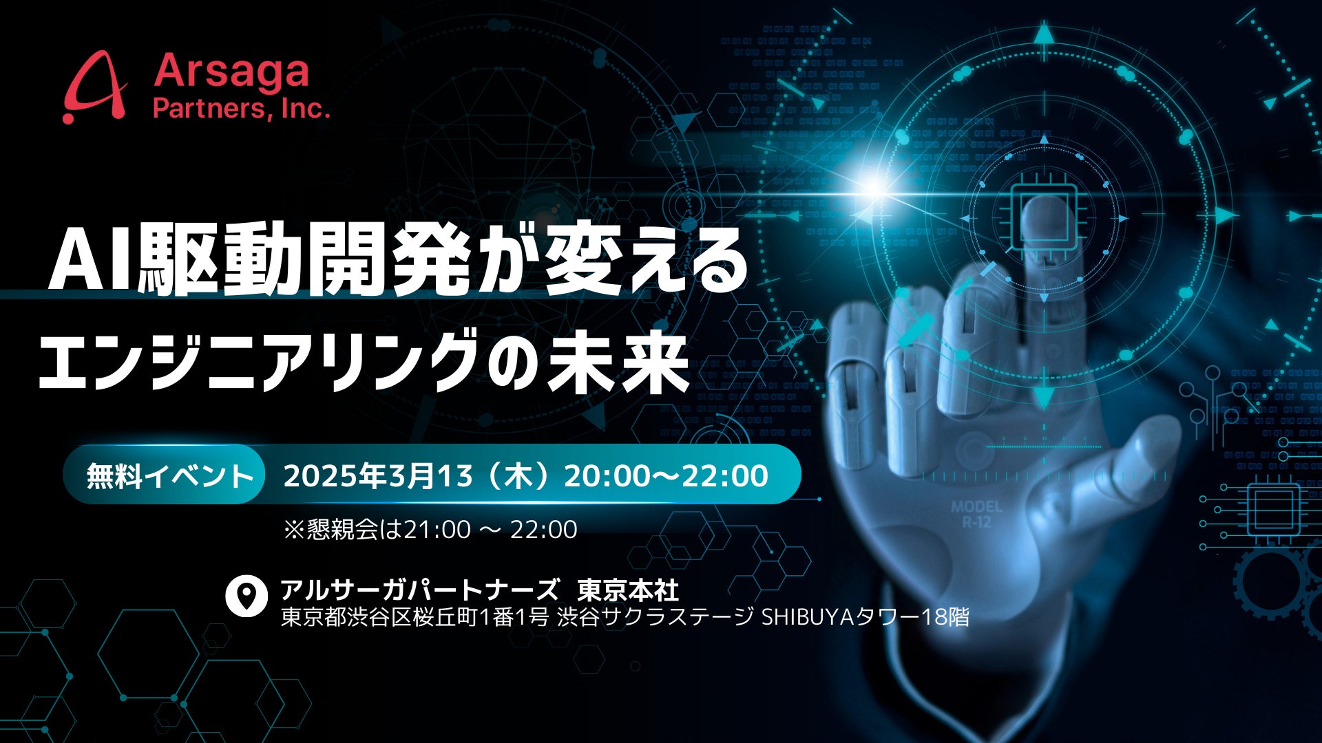 企業のDXを促進するアルサーガパートナーズ株式会社(本社:東京都渋谷区、代表取締役社長 CEO/CTO:小俣泰明、以下「アルサーガパートナーズ」)は、2025年3月13(木)20:00〜、IT業界で活躍するエンジニアを支援する無料イベント&懇親会、「アルサーガCheer Upプロジェクト」を開催いたします。