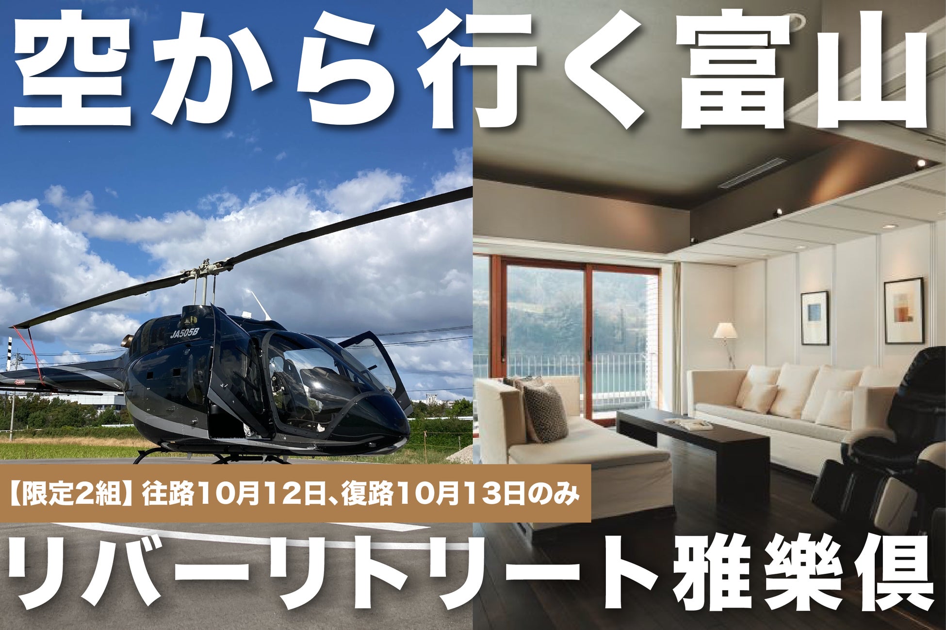 株式会社AirX(本社:東京都千代田区、代表取締役:手塚 究、以下「AirX」)は、リバーリトリート雅樂倶(所在地:富山県富山市)と連携し、富山県へのヘリコプター移動と宿泊がセットになった2組限定「ヘリ移動+リバーリトリート雅樂倶宿泊プラン」の販売を開始することをお知らせいたします。