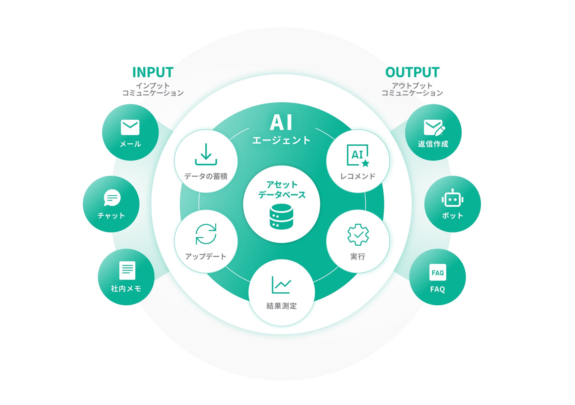 「コムアセット」は、企業内のあらゆるコミュニケーションデータをインプットとして一元管理し、AIがこれを学習・資産化してアウトプットすることで、業務の効率化と省人化を実現するインゲージが提唱するAI時代の新しい概念です。本構想は、以下の3つのステップで企業の業務コミュニケーションを変革します。