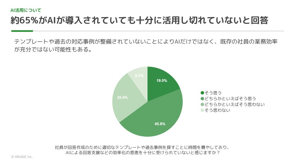 調査結果1:AIを導入しているにもかかわらず、回答作成のための適切なテンプレートや過去の事例を探すのに時間を費やし、AIによる効率化の恩恵を受けていないと感じている人が約65%にのぼるという実態が明らかになりました 。