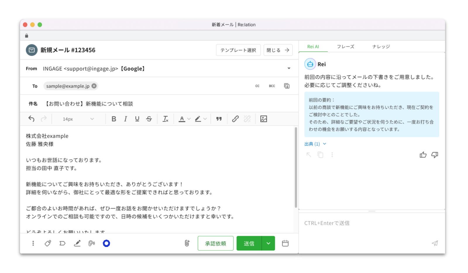 受信したメールの内容をAIが自動で解析し、アセットデータベースから学習した内容を基に、最適な返信文案を瞬時に生成します。単体のAIツールとは異なり、メール以外の電話、チャット、社内メモなど、自社独自のあらゆるコミュニケーションデータからAIが最適なブラッシュアップを提案するため、より文脈に沿った質の高い提案が可能です。