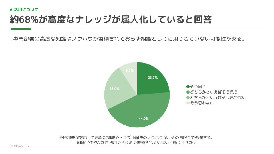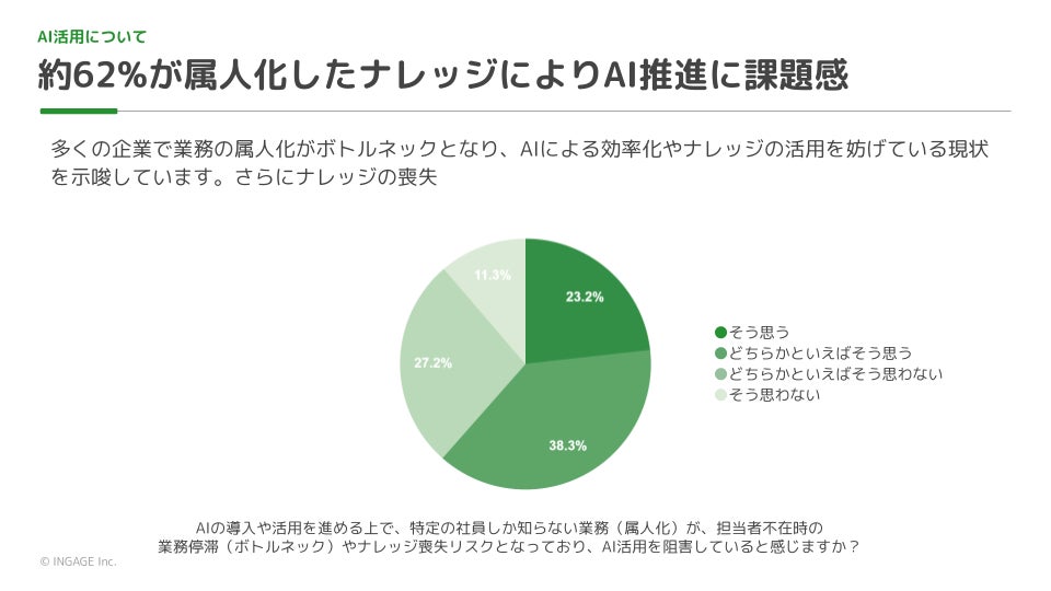 調査結果3:約68%の回答者が専門部署の知識やノウハウが組織全体で再利用可能な形で蓄積されていないと感じており 、文書化されていない「暗黙の了解」が多いことがAI導入の障壁になっていると回答した人も約68%にのぼりました 。さらに、特定の社員しか知らない業務(属人化)が、AI活用の推進を妨げていると感じている回答者が約62%に達しており 、属人化が大きなボトルネックとなっていることが示されました。