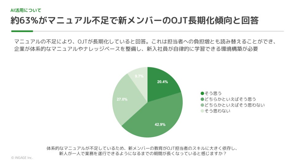 調査結果2:複数のツールを利用していることによる情報管理の課題を感じている人が約68% 、またマニュアル不足により新入社員の教育(OJT)が長期化していると感じている人が約63%にのぼるという結果が出ています 。これにより、ツールや教育にかかるコストが高騰していることが判明しました 。