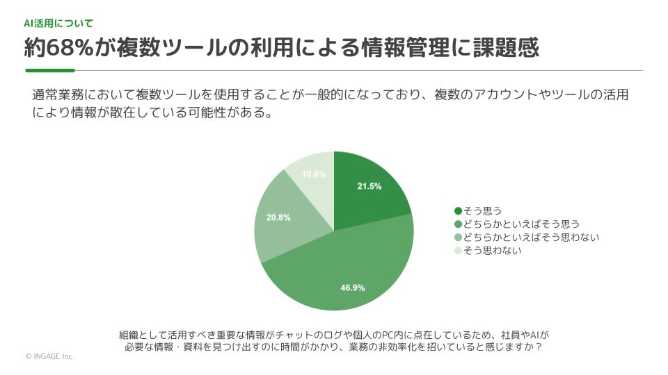 今回の調査を通じて、企業のAI活用は、単なるツール導入にとどまらず、コミュニケーションアセット管理という組織的な課題の解決が不可欠であることが明らかになりました。情報の点在、属人化、マニュアル不足といった課題は、業務の非効率化を招くだけでなく、AIの学習精度向上を妨げ、すべての社員がAIによる効率化の恩恵を十分に受けられない状況に繋がっています。今後、AIと人材活用の両面から、組織全体のアセットを体系的に整備する必要性が示唆されました。