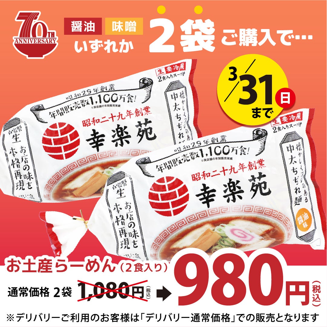 3月31日(日)まで、期間限定で「お土産らーめん2食入り」(醤油味もしくは味噌味)540円(税込)の、いずれか2袋を購入すると、通常価格2袋1,080円(税込)のところ、980円(税込)の特別価格で販売いたします。