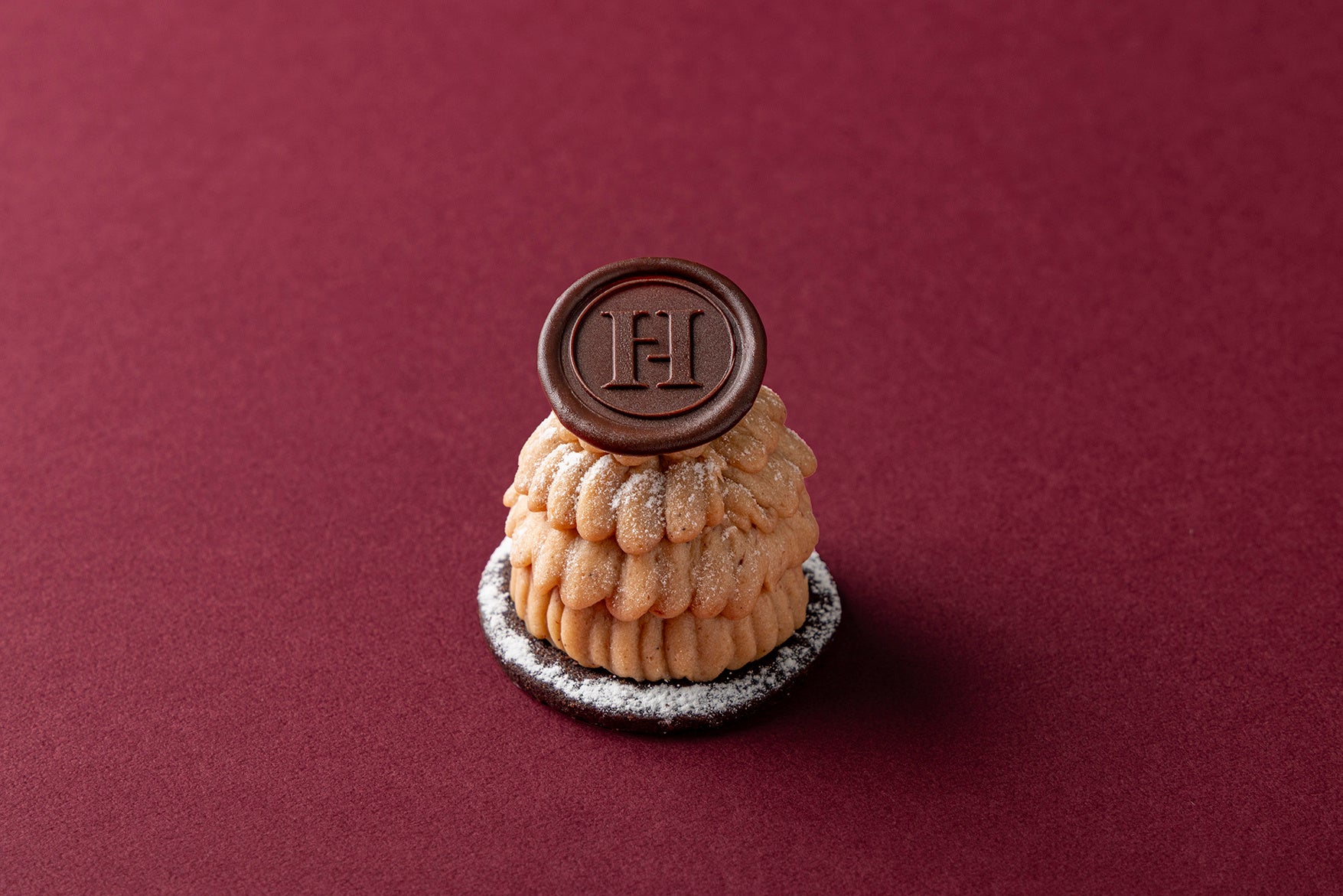 Her lip toのロゴをあしらったシーリングチョコレートがワンポイントのモンブラン。フランス産の栗を使用したマロンクリームの中に、ラム酒で香りづけをした生クリームと栗の渋皮煮を忍ばせて、芳醇な香りが広がるクラシカルな味わいに。