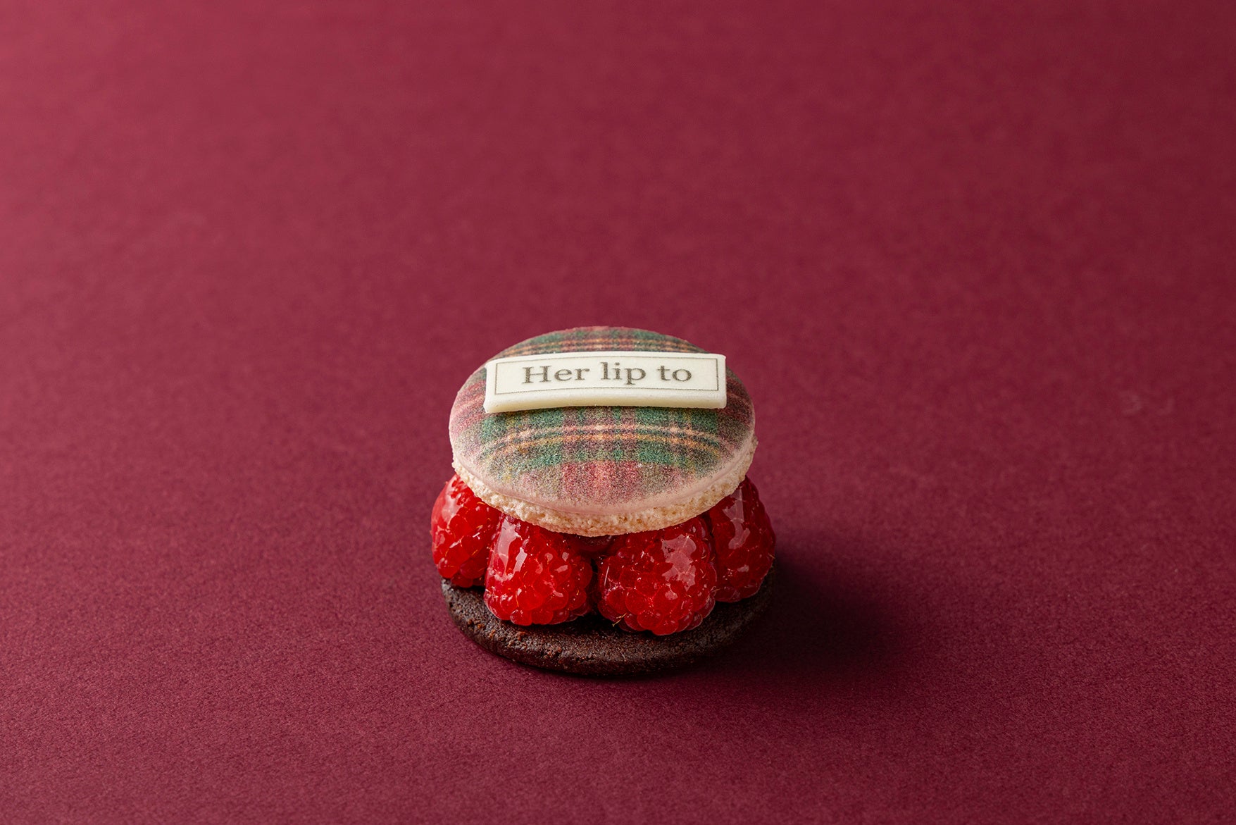 タータンチェック柄のマカロンと真っ赤なラズベリーをまとい、上品な魅力を詰め込んだスイーツ。濃厚なガナッシュチョコレートの上にキャラメリゼしたピーカンナッツを載せ、側面にラズベリーをあしらって瑞々しさをプラス。土台にはビターチョコレートのクッキーを使用することで、全体の味わいを引き締めました。
