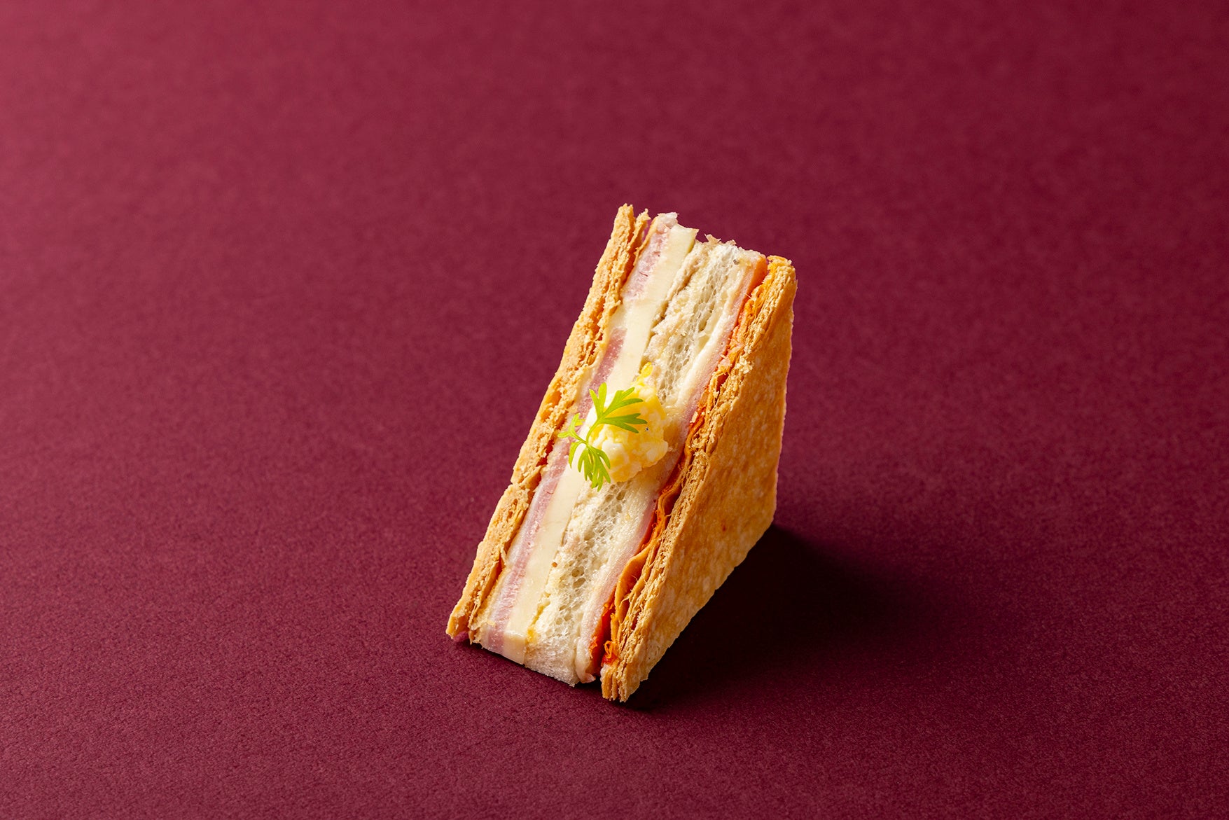 ゴーダチーズや、ジャンボンブラン、セミドライトマト、ベシャメルソースなど約10種の異なる素材を重ねてサクサクのパイ生地でサンド。中にしっとりとした食パンを挟むことで、ボリューム感がある見た目のわりに軽くまとまりのある味わいに仕上げました。